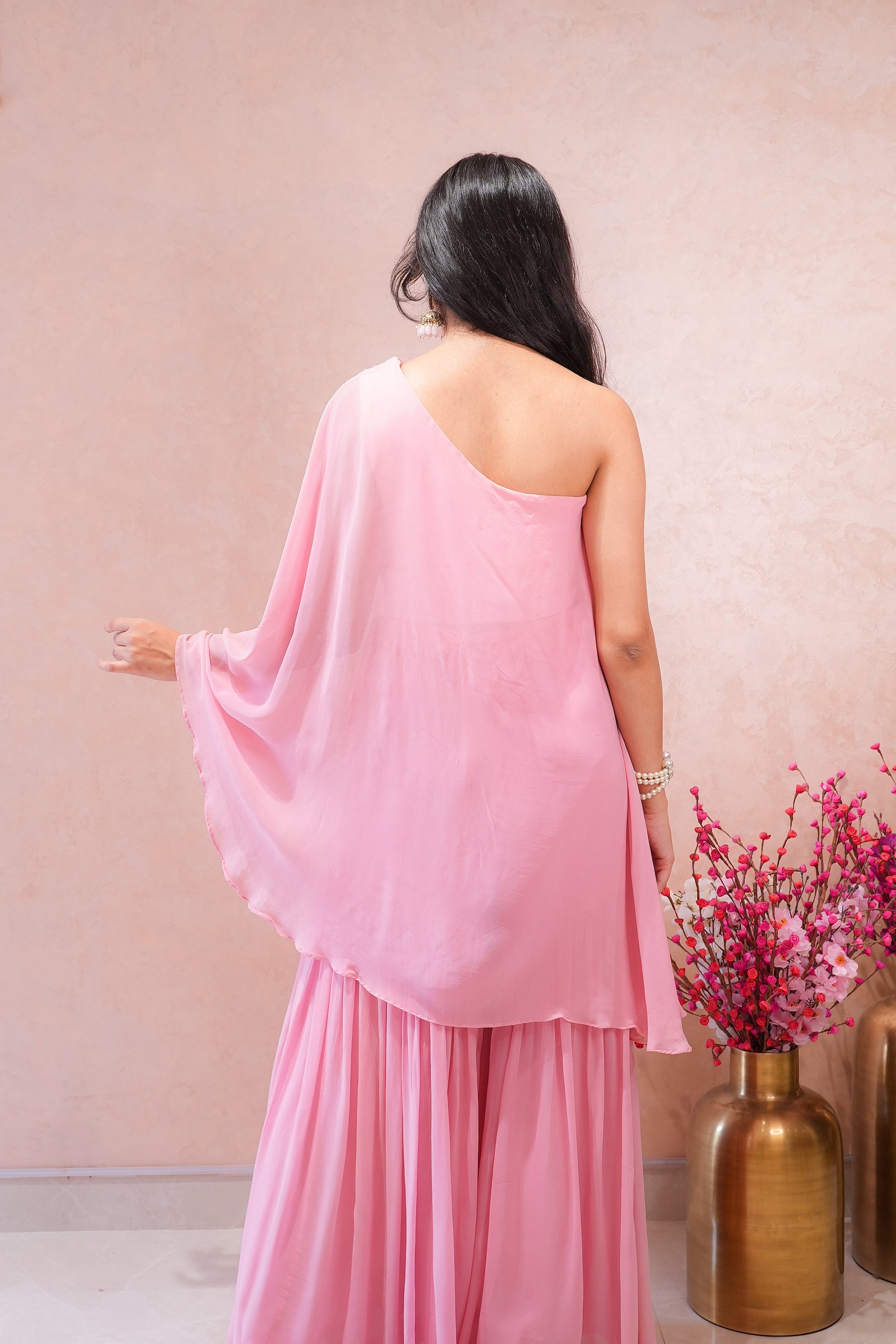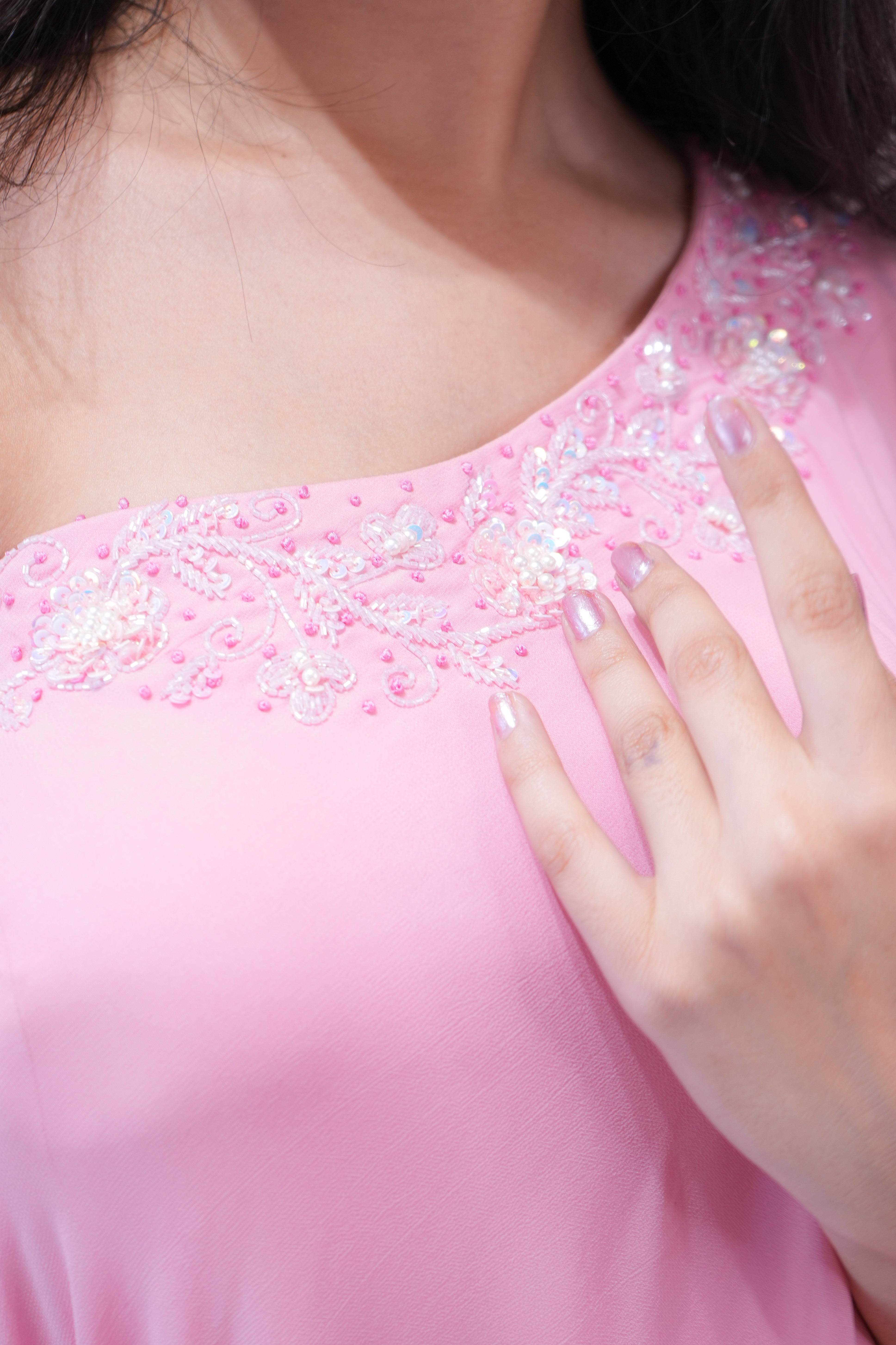 Get ready to make a statement with this stylish off shoulder pink dress that transitions effortlessly from day to night. Handcrafted with intricate details, this dress exudes an elegant and royal charm. Made from high-quality georgette and adorned with rich Indian handwork, it's perfect for embracing a natural and classy look.